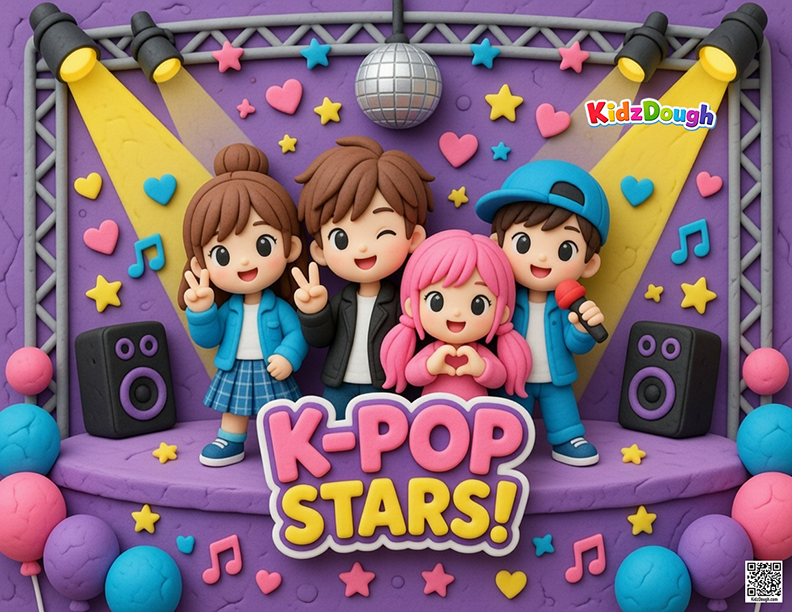 Each mat is packed with colorful details—like a prehistoric landscape for dinosaur digs, an underwater coral reef, a bustling farm, or a vibrant active singing K-Pop music stage with musical elements. Kids press their KidzDough creations right onto the mat, creating 3D scenes that come alive.