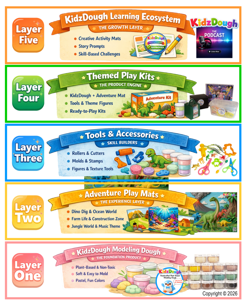 Whether you’re a parent looking for screen-free fun, an educator seeking hands-on activities, or a gift-giver searching for something truly special, here is the break down of each layer of the KidzDough Learning Ecosystem in detail. Let’s climb up the pyramid together!